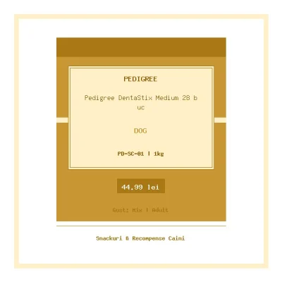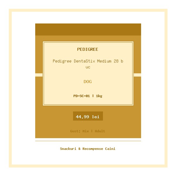 Pedigree DentaStix Medium este un pachet de 28 de bastoane de mestecat ideale pentru cainii adulti de talie medie. Aceste snackuri dentare ajuta la reducerea formarii tartrului cu pana la 80%, contribuind la o igiena orala optima si un zambet sanatos. Cu un gust placut, mixat, care va fi pe placul cainelui dumneavoastra, Pedigree DentaStix ofera o recompensa delicioasa si utila zilnic. Fiecare bastonas cantareste aproximativ 1kg si este special conceput pentru a intari dintii si gingiile cainelui.